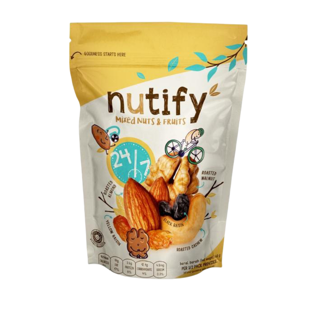 Nutify – Trail Mix 24/7 for Brain 60 g dibuat dari perpaduan walnut, mete, kacang almond,kismis hitam dan kismis kuning sangat cocok menjadi teman makan es krim, yogurt, toping kue , oatmeal atau salad.